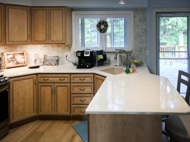Beautiful Kitchens can create a new look for your kitchen with cabinet refacing. Check out one of our newest projects with new cabinets, counter tops, sink and fixtures.