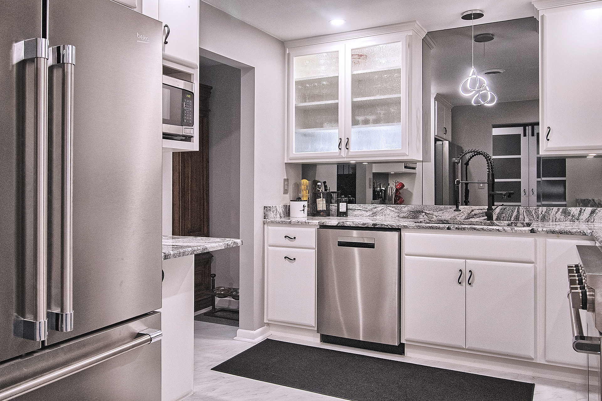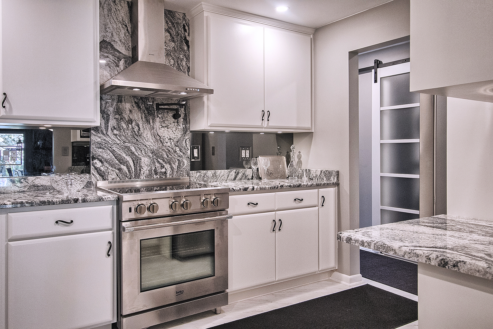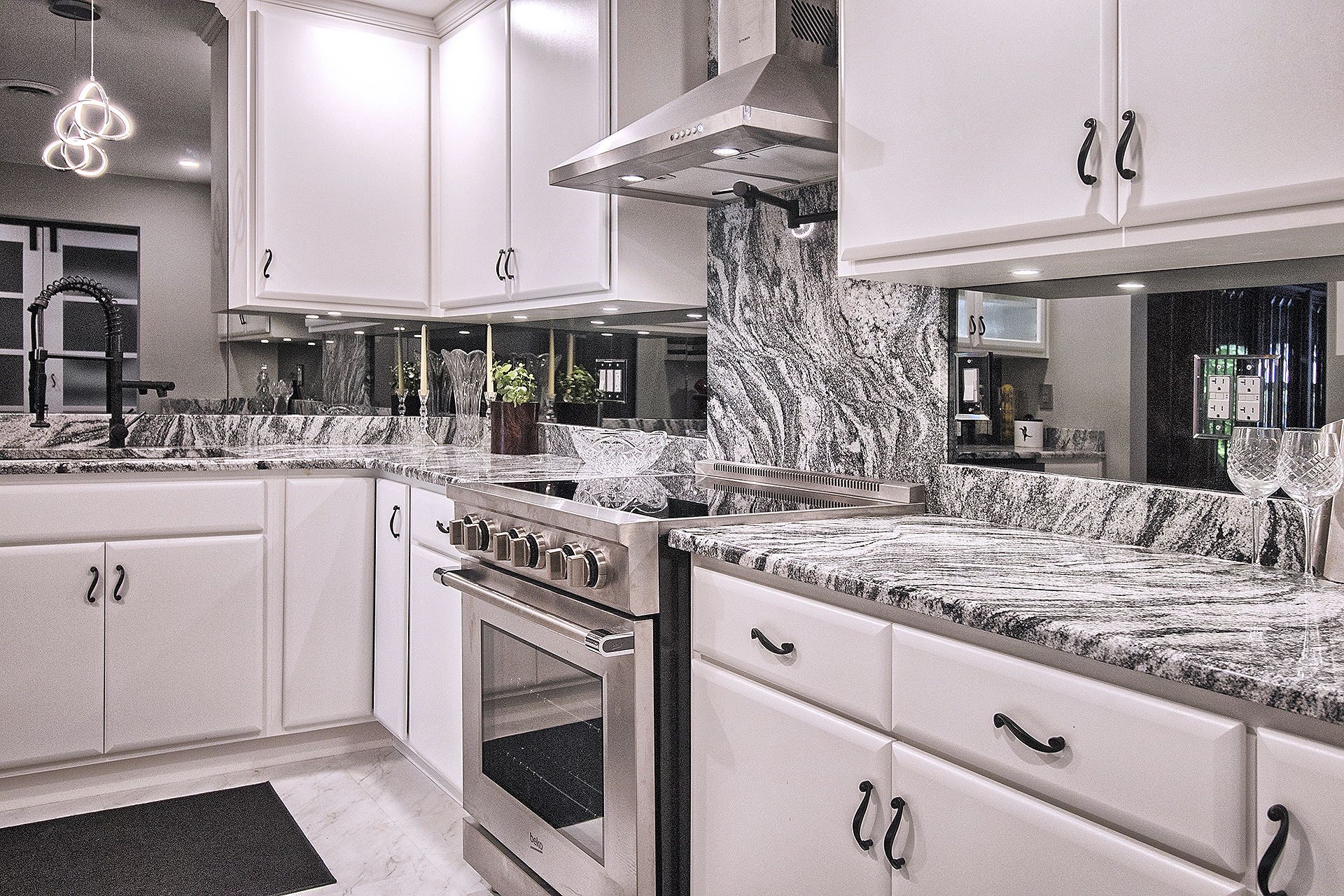 This new kitchen was built with white laminate Prestige cabinets. The countertops are Silver Cloud Granite with 4” backsplash and half bullnose edge. We undermounted a Black Karran QU-630 sink with matching strainers. The hardware was done in a flat black. Plus a mirrored full backsplash.