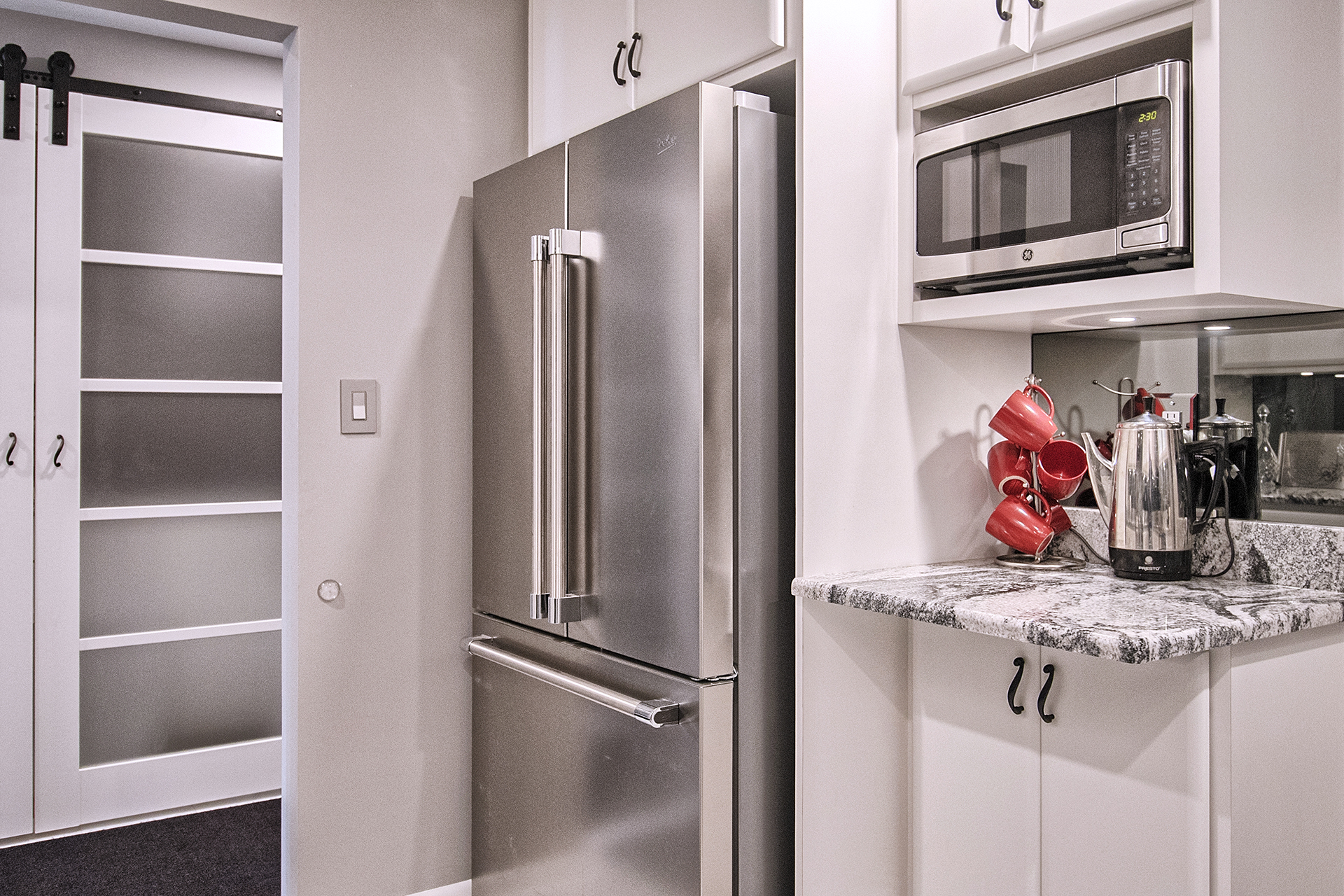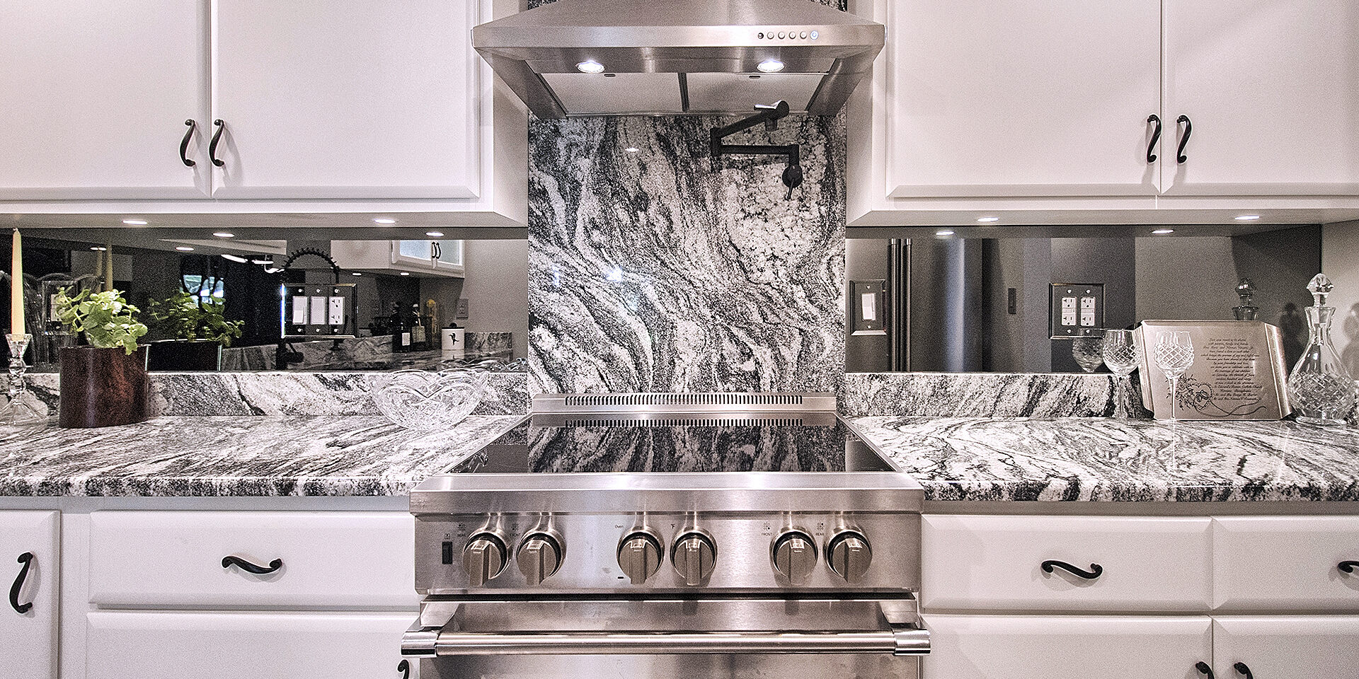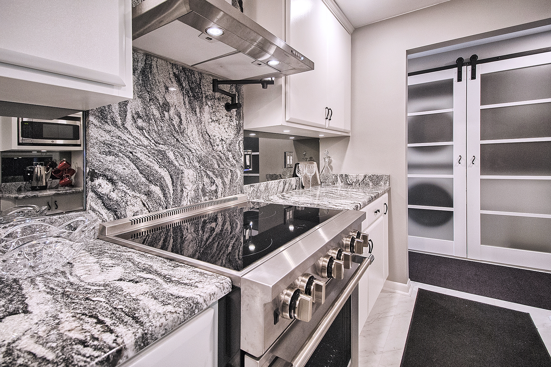 This new kitchen was built with white laminate Prestige cabinets. The countertops are Silver Cloud Granite with 4” backsplash and half bullnose edge. We undermounted a Black Karran QU-630 sink with matching strainers. The hardware was done in a flat black. Plus a mirrored full backsplash.